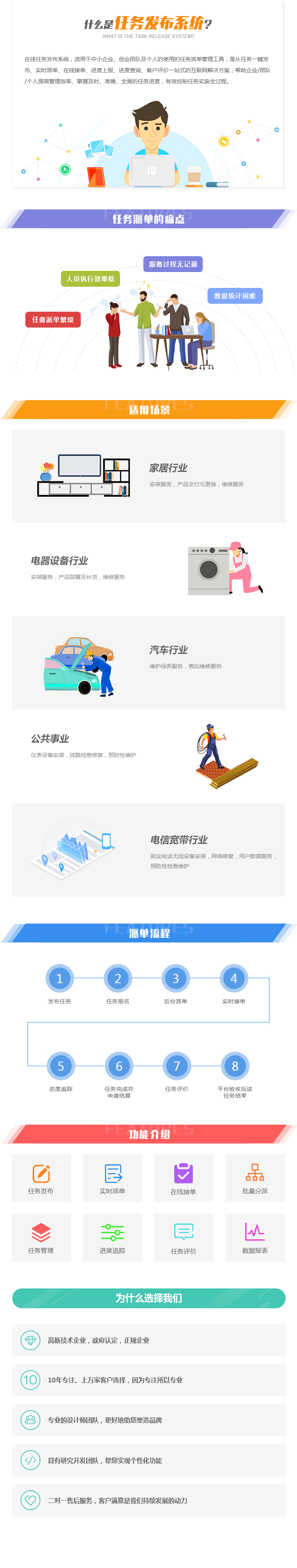 线任务发布系统,适用于中小企业、创业团队及个人的使用的任务派单管理工具,是从任务一键发布、实时派单、在线接单、进度上报、进度查询、客户评价一站式的互联网解决方案,帮助企业/团队/个人提高管理效率、掌握及时、准确、全面的任务进度,有效控制任务实施全过程。